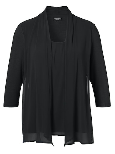 Tolles 2 in 1 Blusenshirt. Es besteht aus weichem Shirtstoff und der vordere Teil ist mit einem weichen Chiffonstoff besetzt, der wie eine offene Blusenjacke aussieht. Super edel und dabei mega bequem !