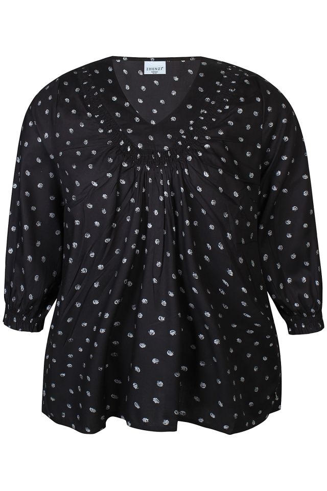 Zauberhafte Schlupfbluse mit feinem Glanz – ein femininer Blickfang für viele Gelegenheiten. Das Modell zeigt sich in elegantem Schwarz mit dezent schimmernden, silberfarbenen Punkten und einem raffinierten V-Ausschnitt, der mit dekorativen Details geschmückt ist. Die 3/4-Ärmel verleihen der Bluse eine leichte, edle Note. Ein vielseitiges Teil, das sowohl zu Jeans als auch zu festlichen Outfits harmoniert.