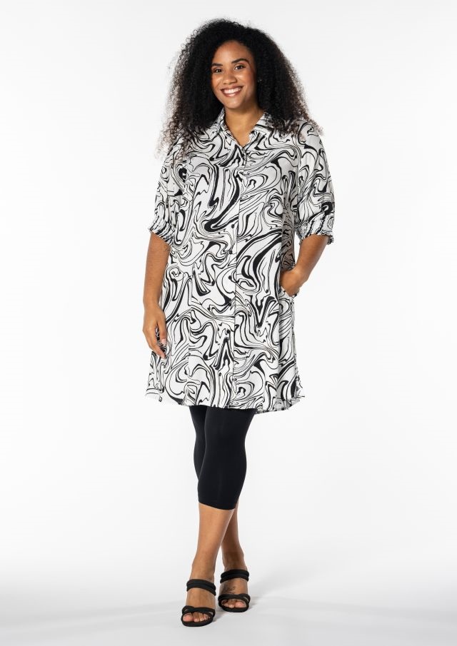 Diese Longbluse aus 100 % Viskose ist mit einem auffälligen Zebra-Print versehen und bringt garantiert frischen Wind in deine Garderobe. Der klassische Hemdkragen und die Knopfleiste verleihen ihr eine elegante Note, während die 3/4-Ärmel mit Smock-Bündchen für einen femininen Akzent sorgen. Zusätzlich bietet die Bluse praktische Seitentaschen und eine schmeichelhafte Passform.
