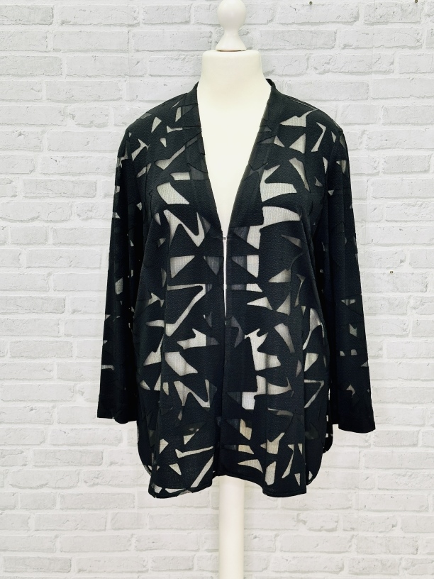 Elegante Blusenjacke in Ausbrenner-Optik. Sie wird mit einem kleinen Häkchen geschlossen und ist stellenweise leicht transparent. Sehr edel und elegant