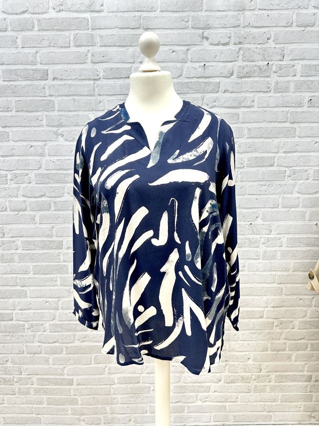Diese Blusentunika in Marine mit naturfarbenem Muster kombiniert eleganten Look mit maximalem Tragekomfort. Der streckende V-Ausschnitt sorgt für eine feminine Silhouette, während der weiche, fließende Stoff sanft die Figur umspielt. Perfekt für Büro, Freizeit oder ein schickes Dinner.