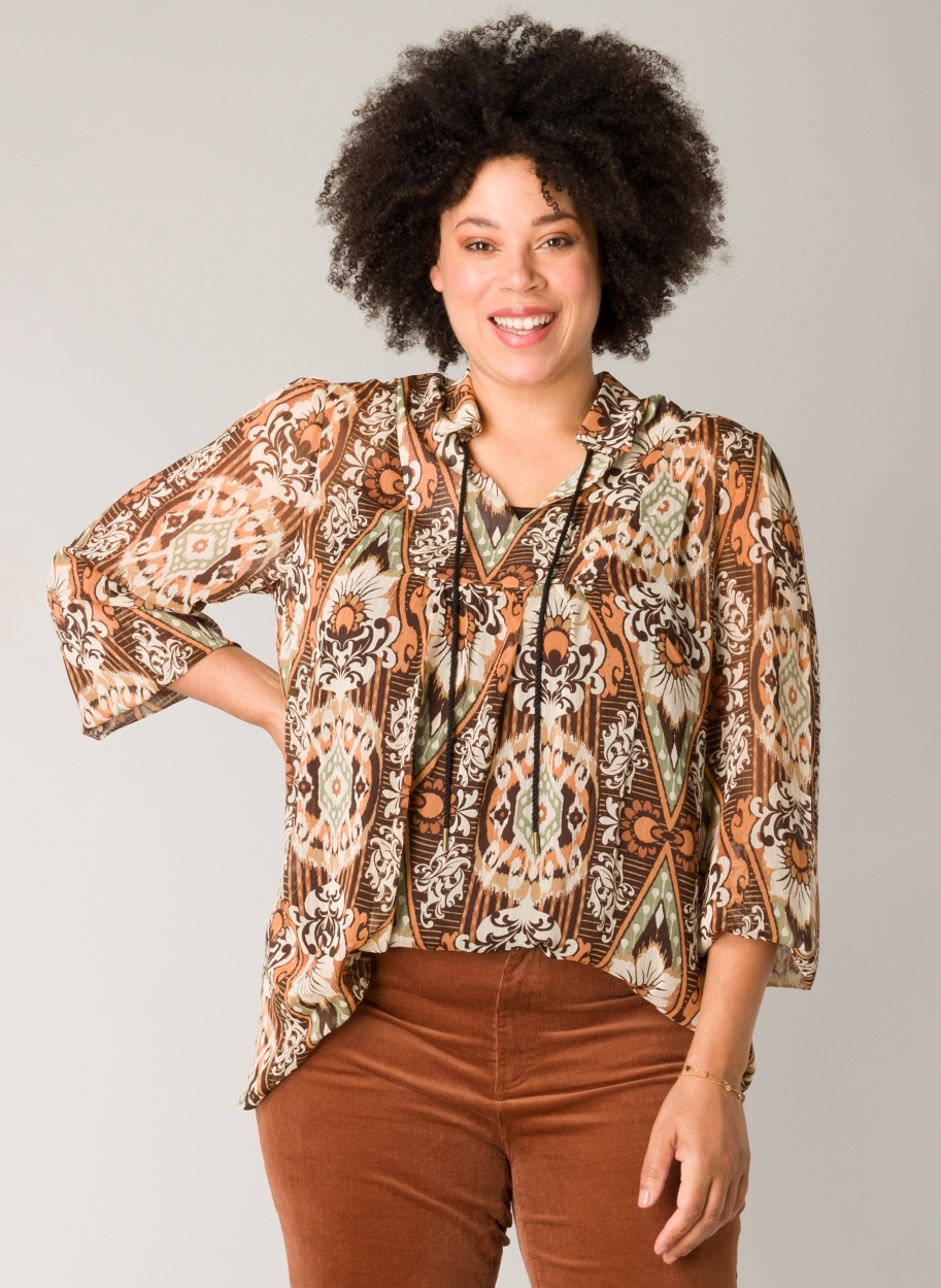 Zauberhafte Blusentunika mit edelem Muster in warmen Herbsttönen. Sie hat einen V-Ausschnitt mit Hemdkragen und unter dem leicht transparenten Stoff ist noch ein Top aus weichem Shirtstoff. Perfektes 2 in 1 Outfit