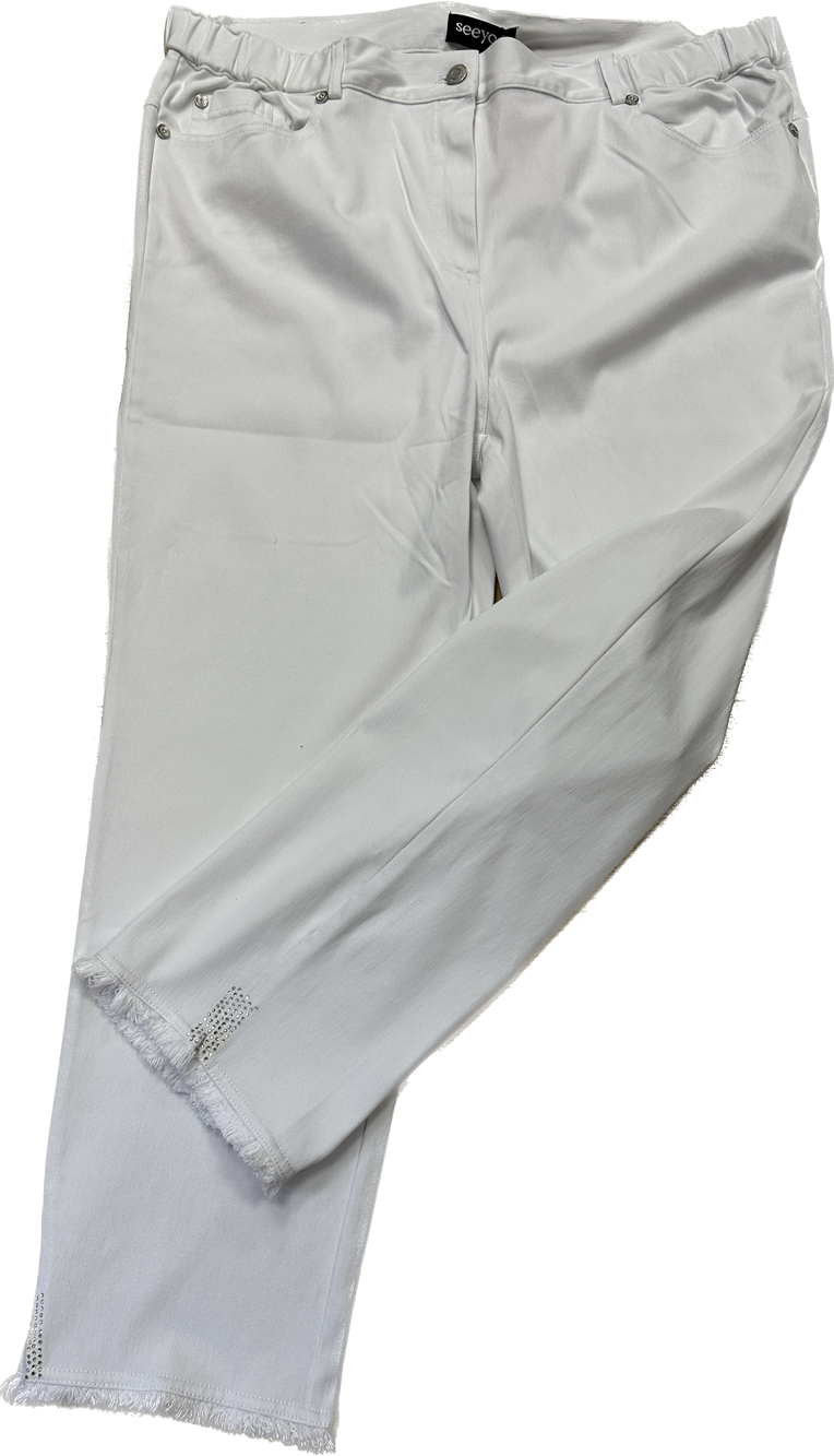 Diese Hose ist in einer verkürzten Form geschnitten "Cropped" mit 5-Pocket Schnitt und kleinen, mit Steinchen verzierten Seitenschlitzen