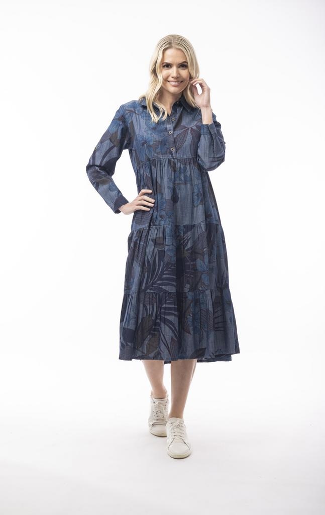 Tolles Denim-Kleid im Boho Style mit dezentem Blütenmuster. Es ist komplett durchgeknöpft, hat einen Hemdkragen und 3/4 lange Ärmel. Sehr schön und lässig