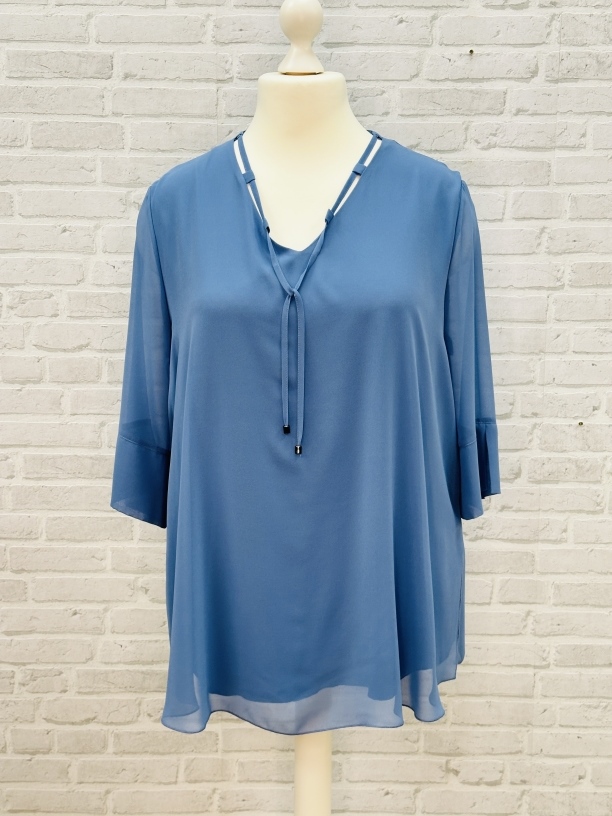 Der V-Ausschnitt wirkt streckend und die edle Verzierung mit feinem Band am Ausschnitt macht es zum echten Hingucker. Die semistransparenten Ärmel in 3/4-Länge unterstreichen die Leichtigkeit des Designs. Der leicht ausgestellte Schnitt umspielt gekonnt die Figur und fällt locker über die Hüfte – ideal, um kleine Problemzonen charmant zu kaschieren. In bequemer Schlupfform lässt sich die Tunika mühelos tragen und vielseitig kombinieren – ob zu festlichen Anlässen oder als stilvoller Alltagsbegleiter.