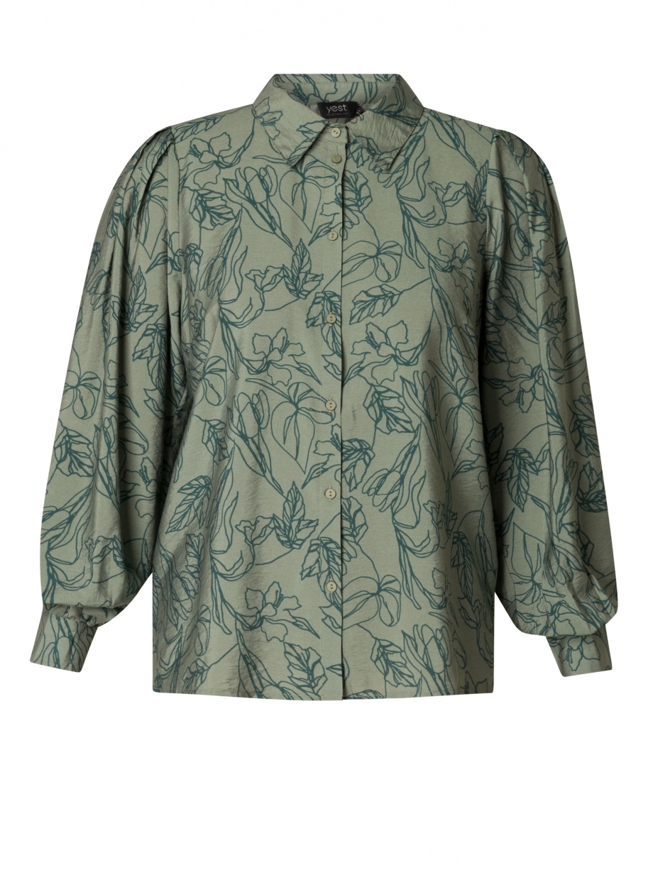 Diese grün gemusterte Bluse besteht zu 85% aus Ecovero-Viskose, einem nachhaltigen und umweltfreundlichen Stoff. Die Bluse hat einen flachen Kragen und einen Knopfverschluss vorne. Die Falten an der Schulterpartie verleihen dem Design ein subtiles, raffiniertes Detail.