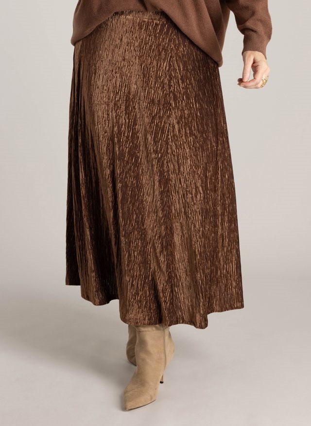 Dieser Plisseerock bringt sofort festlichen Glanz in deinen Look. Der geschmeidige Stoff mit feinem Metallic-Faden fängt das Licht wunderschön ein und fällt weich und elegant um die Silhouette – perfekt für kurvige Frauen, die modische Highlights lieben.