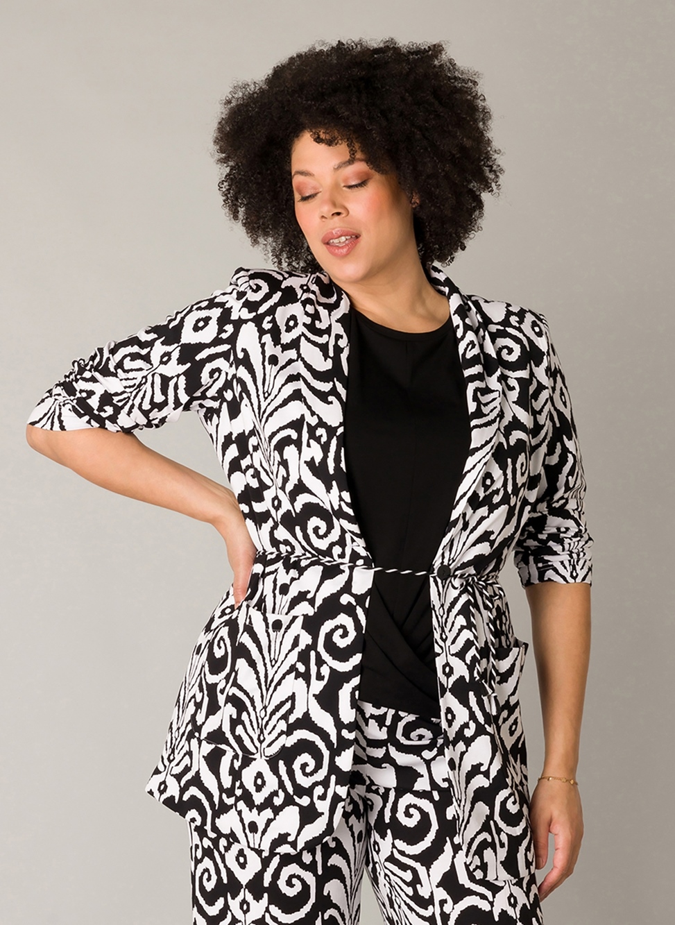 Regular Fit Blazer mit schwarz-weißem Ikat-Print. Dieser Sommer-Jersey-Blazer hat einen Schalkragen und wird mit 1 Knopf geschlossen.