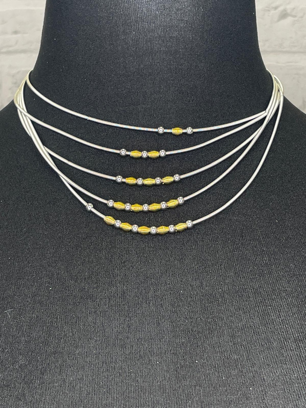 Mehrreihige Kette aus elastischen Metallbändern und mit schönen Schmuckelementen und Magnetverschluss