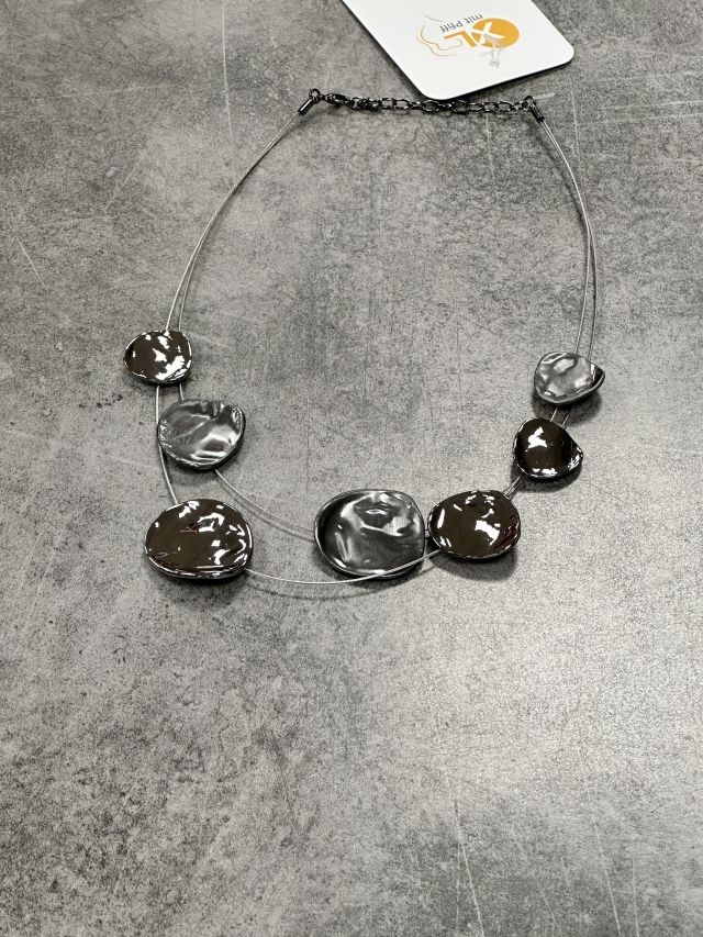 Kurze Kette mit anthrazitfarbenen Schmuckelementen an mehreren Stahlbändern