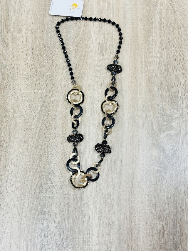 Diese ausgefallene Kette goldfarben und schwarz verbindet eleganten Chic mit einem modernen Twist. Der markante Anhänger macht sie zum echten Blickfang und rundet trendige Outfits perfekt ab.