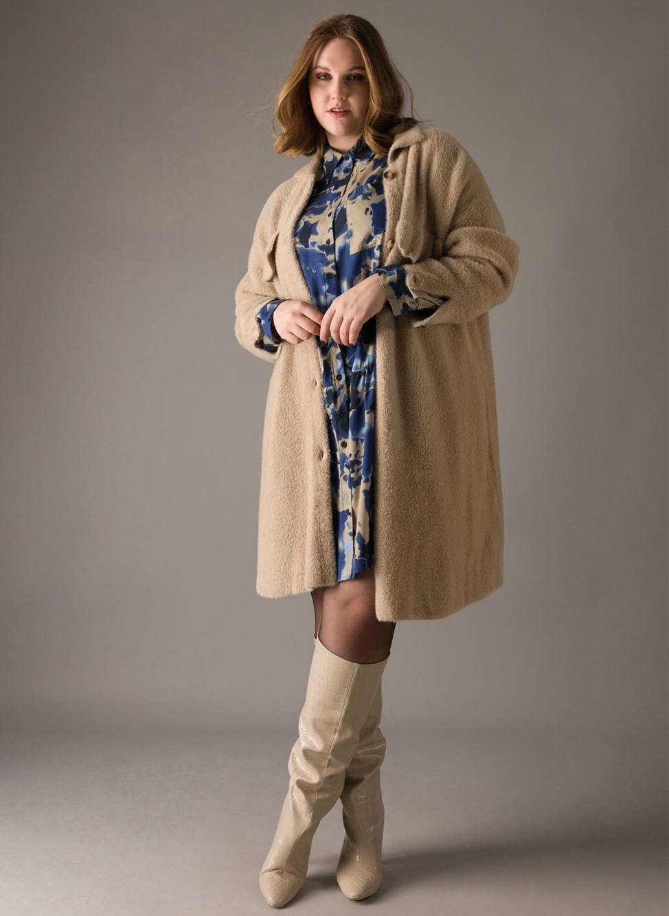 Dies ist eine weiche, pelzige Strickjacke mit langen Ärmeln, flachem Kragen und einem Knopfverschluss auf der Vorderseite und an den Ärmelbündchen.Die lange Strickjacke hat Laschen auf der Brust und eine gerade Passform.
