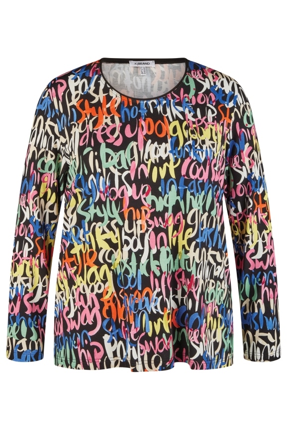 Bunt gemustertes Langarmshirt mit "cooler" Schrift in vielen Farben. Lässig und fröhlich