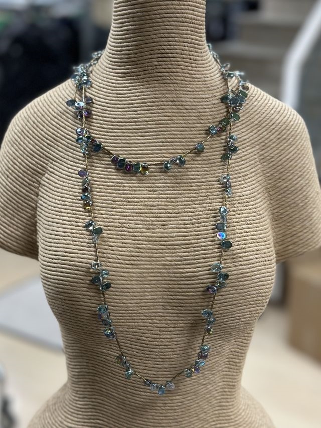 Zauberhafte lange Kette mit feingliedrig angeordneten Glassteinchen und goldfabenen Zwischenstücken. Kann man auch doppelt um den Hals tragen