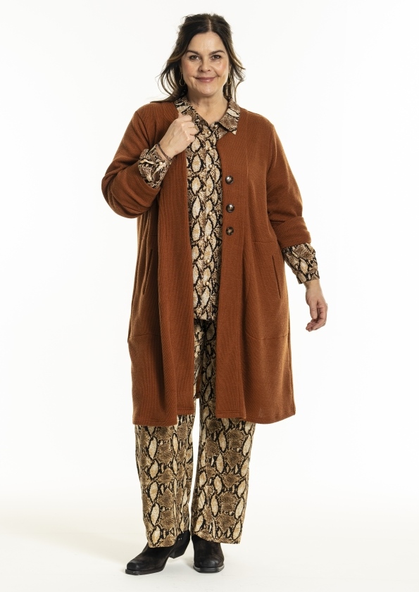 Einfach nur WOW. Dieser lange Cardigan hat alles was man sich wünscht. Er ist lang geschnitten, hat einen runden Ausschnitt, der aber nicht bis oben geknöpft ist, also auch offen als V-Ausschnitt umgeschlagen werden kann. Geschlossen wird er mit 3 Knöpfen UND er hat Taschen. Von den wunderbaren Farben in schwarz oder cognac mal ganz zu schweigen