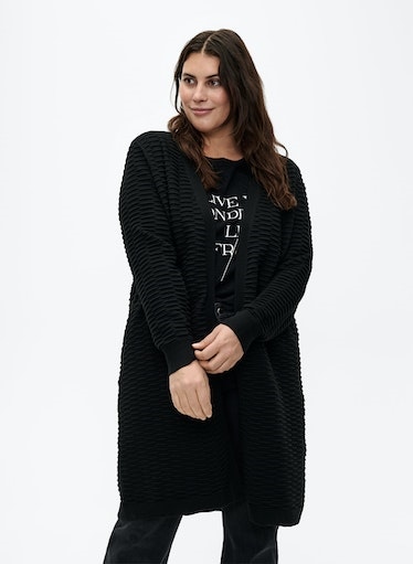 Lange Strickjacke aus einer weichen Baumwoll- und Viskosemischung mit toller Struktur. Diese Strickjacke hat dekorative gerippte Ränder und eine lockere, offene Passform.