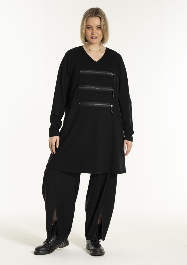 Diese moderne Tunika besticht durch dekorative Reißverschlüsse auf der Vorderseite, die für einen markanten Look sorgen. Der V-Ausschnitt und die lange Form mit leichter A-Silhouette verleihen eine fließende Optik und kaschieren zugleich geschickt. Das Material aus Nylon und Baumwolle verbindet Struktur mit Tragekomfort. Ein vielseitiges Teil, das sich leger wie auch elegant stylen lässt.