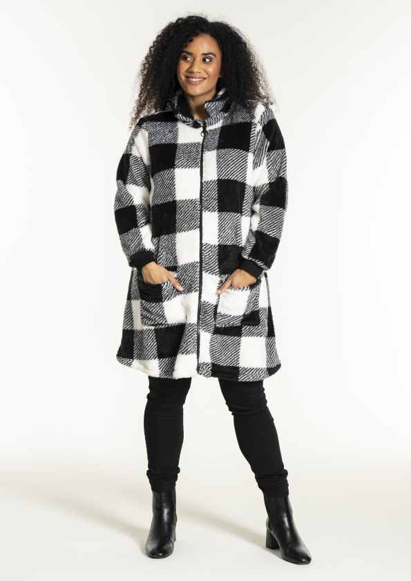Der Kuschelmantel ist ein modischer Outdoor-Mantel im angesagten Karodesign. Mit durchgehendem Reißverschluss, großem Kragen zum Umklappen und langen Ärmeln mit schmalen Bündchen sorgt er für eine moderne Silhouette und hohen Tragekomfort. Praktische Fronttaschen runden das Design ab. In Black/White – dieser Mantel ist ein echter Blickfang für die Übergangszeit.