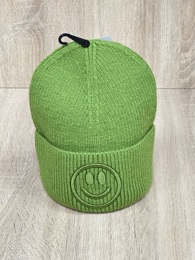 Modische Strickmütze mit aufgesticktem Smiley und breitem Rand.