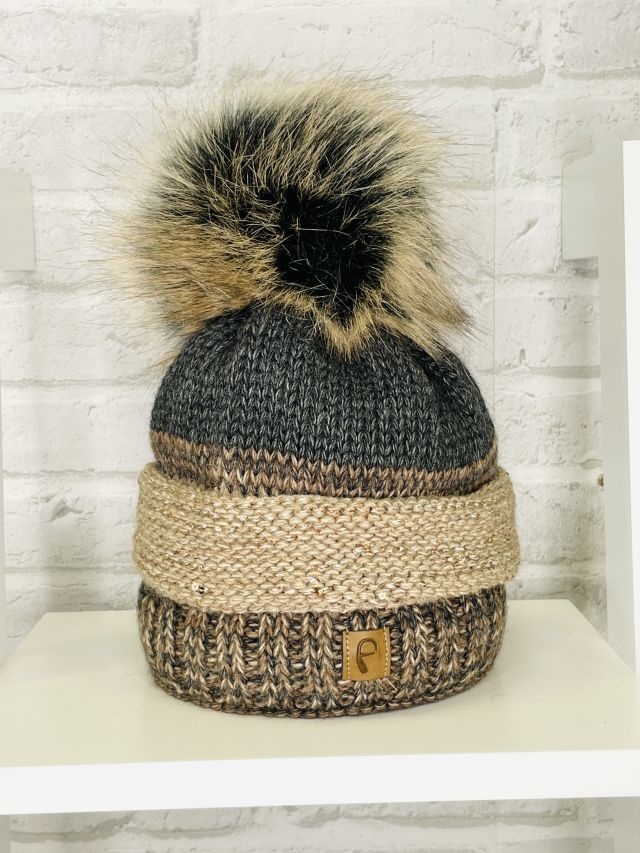 Lässig und edel zugleich ist diese Mütze in Strick mit kleinen Pailletten am hellbraunen Stück. Sie hat einen flauschigen Bommel (Fake-Fur, KEIN echter Pelz) und ist innen mit weichem Fleecestoff gefüttert. Da friert man garantiert nicht - und sieht super aus !