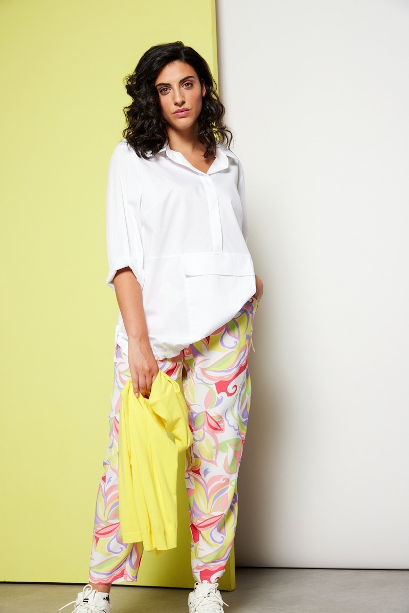 Weich fließende Schlupfhose aus edlem Viskose-Stoff. Sie hat ein tolles Muster, einen elastischen Bund und Eingrifftaschen.