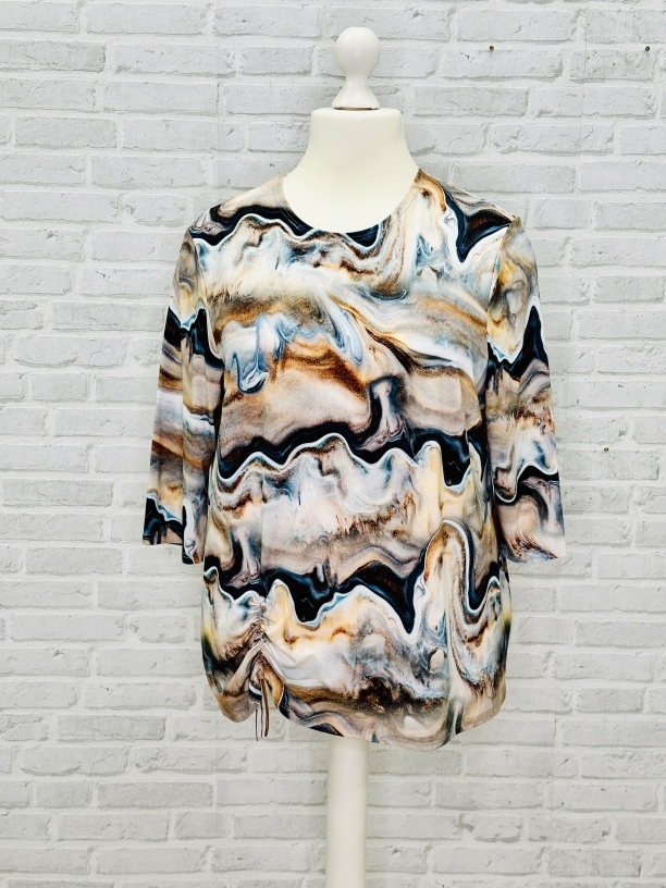 Schönes, elegantes Shirt mir rundem Ausschnitt, 3/4 langem Arm und tollem Muster. Am Saum ist es auf einer Seite leicht gerafft mit schönen Bändchen