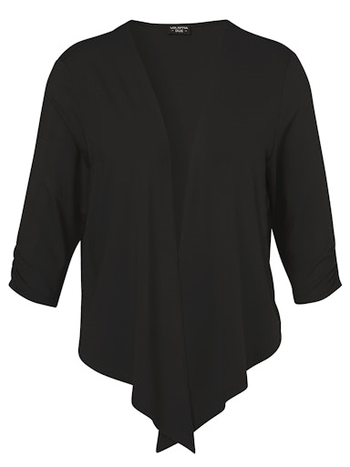 Weich fließende, leichte Shirtjacke/Bolero mit 3/4 langem Arm. Sie ist vorne zipflig lang geschnitten, hinten etwas kürzer. Super auf Kleidern, Tops oder leichten Blusen zu tragen