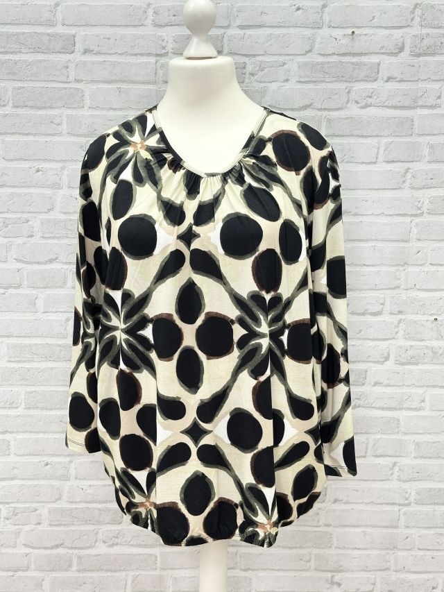 Ein wunderbar weiches Shirt mit langem Arm – ideal für jeden Tag und doch mit dem gewissen Etwas. Der feminine V-Ausschnitt ist mit feinen Falten gearbeitet, die dem Oberteil eine elegante Note verleihen. Der elastische Saum sorgt für einen bequemen Sitz und eine schöne, leicht legere Silhouette. Das dezente Muster rundet den Look perfekt ab und macht das Shirt zu einem vielseitigen Kombipartner – ob zu Jeans, Stoffhose oder Rock.