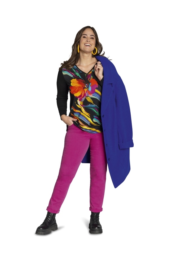 Toll gemustertes Langarmshirt mit V-Ausschnitt und tollem Druck vorne. Zwei kleine Schlitze vorne und eine leichte A-Linie machen das Shirt zu etwas ganz besonderem.