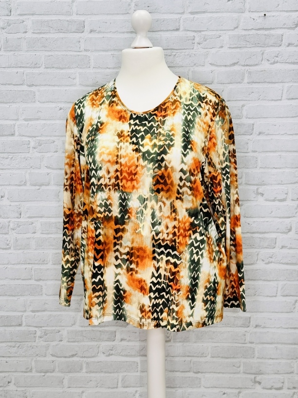 Wunderbar weiches Shirt etwas kürzer geschnitten) mit undem Ausschnitt und langem Arm. Tolles Muster in Oliv/Orange/Natur - super Herbstfarben