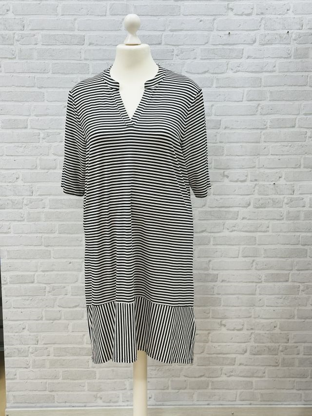 Weich fließendes Shirtkleid im Tuniky-Style. Es hat ein feines Streifenmuster in schwarz/weiss