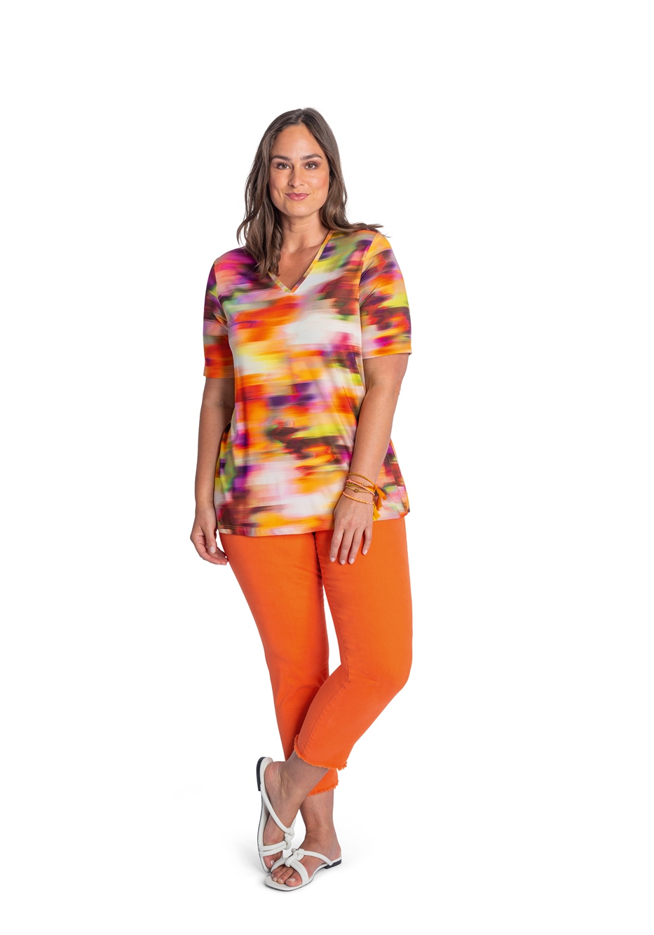 Farbenfrohes Slinky-Shirt mit V-Ausschnitt und kurzem Arm