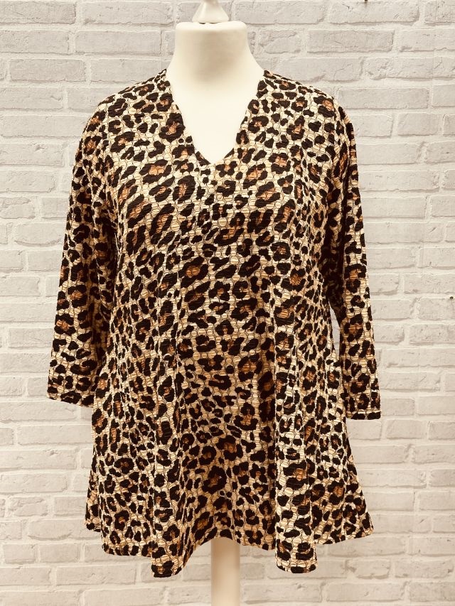 Sehr schönes Tunika Shirt in fließender A-Linie mit langem Arm. Es hat einen schmeichelnden V-Ausschnitt mit Wellen und zaubert eine tolle Optik am Hals. durch den nach unten weit fallenden Schnitt ist es ein echter Hingucker - und das Muster ist auch ganz besonders toll. Praktisch sind die seitlichen Eingrifftaschen. Der Stoff hat eine tolle Struktur, damit wirkt das Oberteil mehr wie ein Pullover als ein Shirt