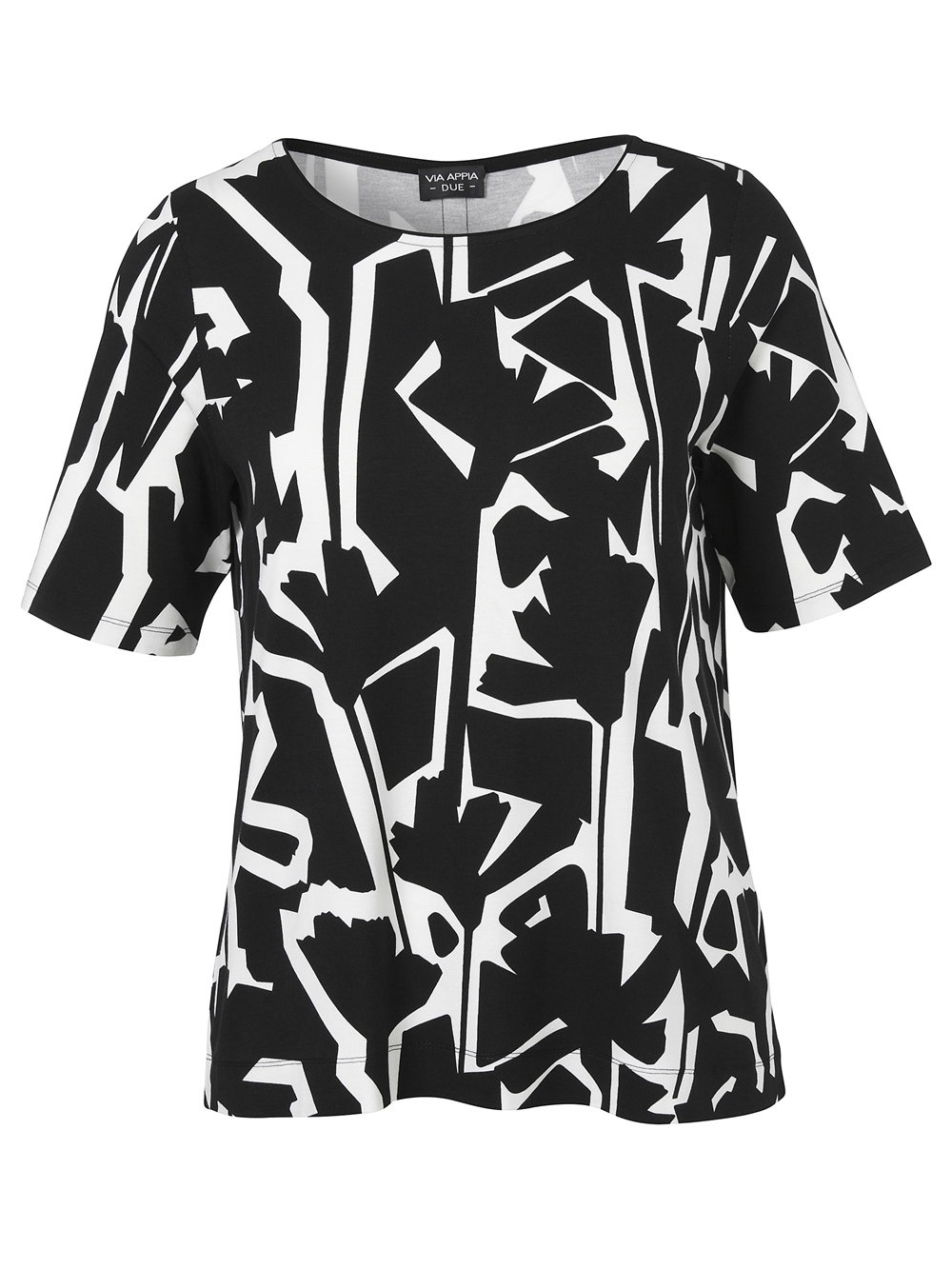 Mit diesem VIA APPIA DUE T-Shirt bringst du moderne Eleganz und Wohlfühlkomfort in Einklang! Der klassische Rundhalsausschnitt und die halben Ärmel sorgen für eine zeitlose Silhouette, während das ausdrucksstarke Druckmotiv in Schwarz und Ecru für einen stilvollen Eyecatcher-Effekt sorgt. Dank des weichen, elastischen Viskose-Elasthan-Mixes schmiegt sich das Shirt angenehm an deine Haut – ideal für lange Sommertage im Büro oder in der City.