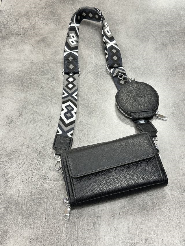Kleine Tasche mit 2 großen Reißverschlussfächern und einem Handyfach mit Überschlag. Aufteilung: großes Reißverschlussfach und innen kleine Einsteckfächer und ein Reißverschlussfach. Eines der beiden Reißverschlussfächer hat eine Aufteilung wie eine Geldbörse und es passt unheimlich viel rein. Sie hat einen schön gemusterten Riemen mit zusätzlichem kleinen Reißverschlusstäschchen daran.