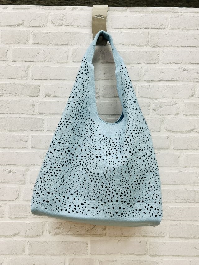 Tolle mittelgroße Beuteltasche mit Lochmuster. Sie kann prima über der Schulter getragen werden. Verschlossen ist sie mit einem Reißverschluss und sie hat eine separate Innentasche, die auch noch mit einem Reißverschluss und Innenfächern versehen ist. Sie kann auch separat getragen werden. Wuasi "Tasche in Tasche"