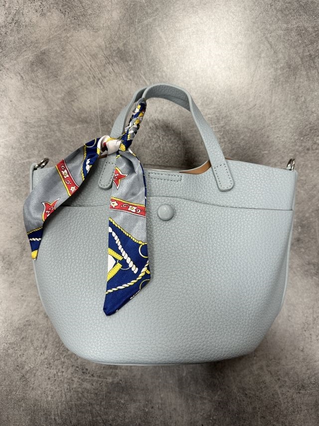 Pfiffige Tasche (wie ein Körbchen geformt) mit separater Innentasche im gleichen Farbton und vorne einem Einschubfach mit Druckknopf. Sie hat kleine Henkel und zusätzlich einen abnehmbaren breiten, gemusterten Schultergurt. Das farblich abgestimmte Tuch kann man auch abnehmen.