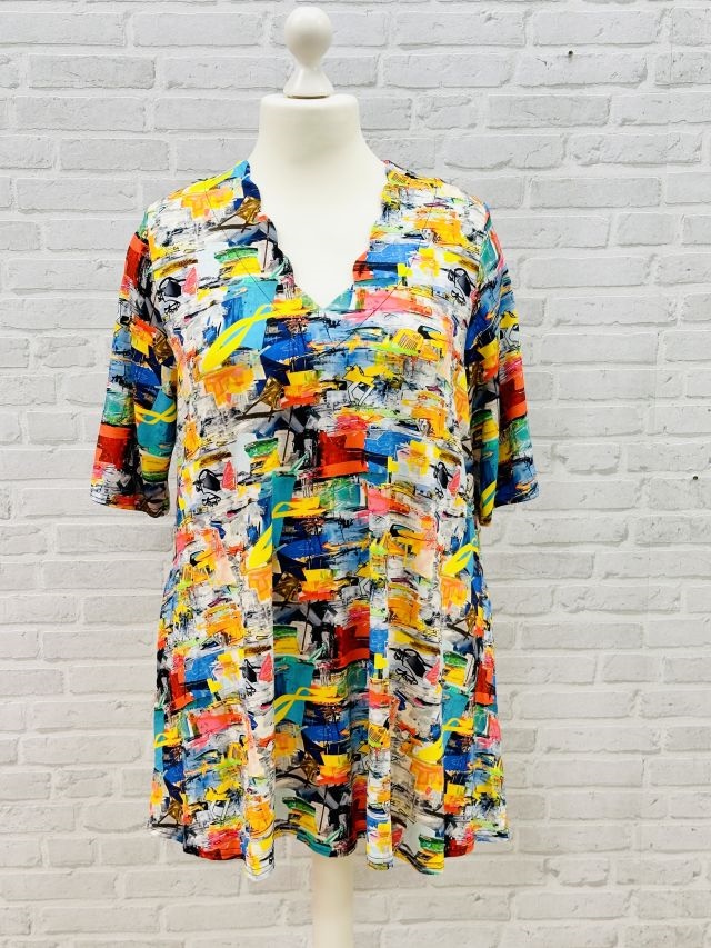Sehr schönes Tunika Shirt in fließender A-Linie mit kurzem Arm. Es hat einen schmeichelnden V-Ausschnitt mit Wellen und zaubert eine tolle Optik am Hals. durch den nach unten weit fallenden Schnitt ist es ein echter Hingucker - und das Muster ist auch ganz besonders toll. Praktisch sind die seitlichen Eingrifftaschen.