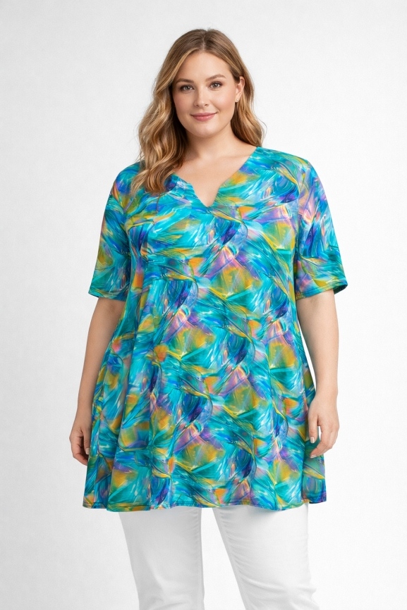 Ein luftiges, angenehm tragbares Shirt mit Wow-Effekt – perfekt für den Sommer. Ob solo getragen oder mit einem leichten Cardigan kombiniert – dieses Tunika-Shirt ist vielseitig einsetzbar und ein echtes Statement für moderne XL-Mode mit Stil.