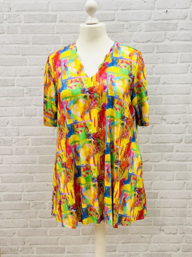 Sehr schönes Tunika Shirt in fließender A-Linie mit kurzem Arm. Es hat einen schmeichelnden V-Ausschnitt mit Wellen und zaubert eine tolle Optik am Hals. durch den nach unten weit fallenden Schnitt ist es ein echter Hingucker - und das Muster ist auch ganz besonders toll. Praktisch sind die seitlichen Eingrifftaschen.