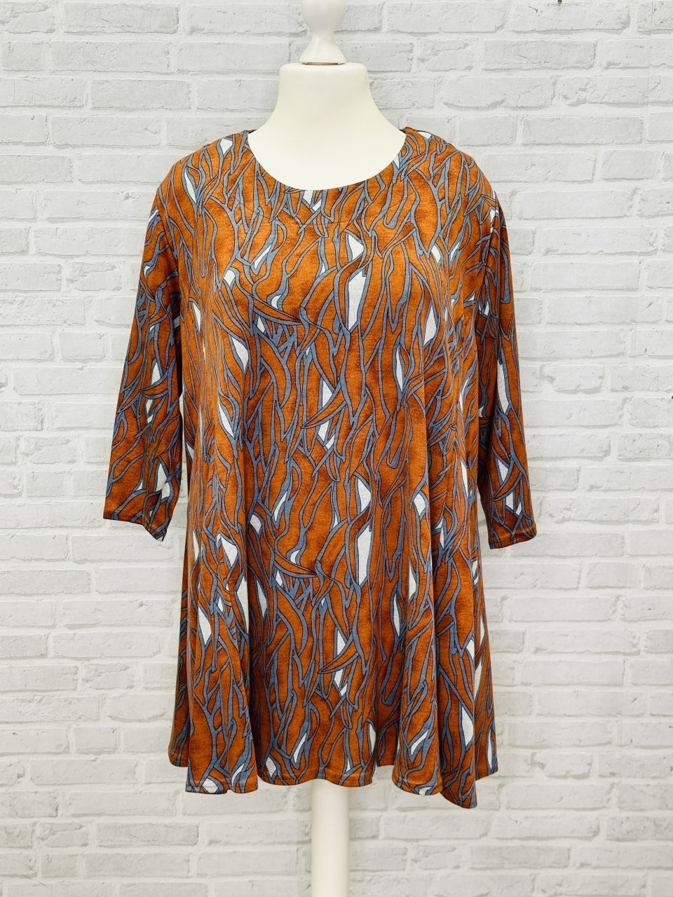 Sehr schönes Tunika Shirt in fließender A-Linie mit 3/4 Arm. Es hat einen runden Ausschnitt und eine Wiener Naht für die tolle Figur. Durch den nach unten weit fallenden Schnitt ist es ein echter Hingucker - und das Muster ist auch ganz besonders toll. Der Stoff ist etwas dicker, wie ein leichter Pulli/Sweatstoff