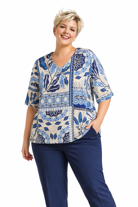 Diese super weiche Viskose-Tunika bringt Leichtigkeit und Style perfekt zusammen. Der edle Print verleiht dem Look eine besondere Ausstrahlung, während der fließende Stoff sanft über die Figur fällt und für maximalen Komfort sorgt. Der V-Ausschnitt setzt einen femininen Akzent und macht das Design schön locker und modern.