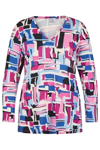 Dieses modische Shirt in Royalblau überzeugt mit seinem grafischen Allover-Print und einer femininen, leichten A-Linie. Der streckende V-Ausschnitt setzt die Figur perfekt in Szene und sorgt für eine schmeichelnde Silhouette. Kleine Seitenschlitze bieten zusätzliche Bewegungsfreiheit und machen das Shirt zum bequemen Begleiter. Die weiche Viskose-Stretch-Qualität liegt angenehm auf der Haut und ist ideal für den Alltag oder lässige Freizeit-Looks.